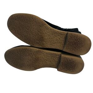Black soft suede boot with zipper closures on the side. Faux buckle and strap at each ankle. Small elastic cutout in calf for flexibility.