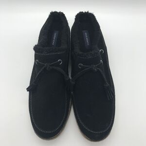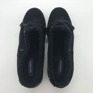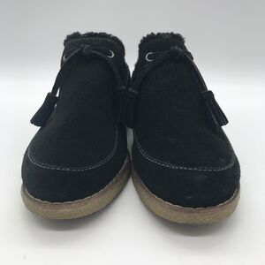 Lands' End Black Suede Faux Fur Lined Clogs Women 7.5 Tasseled Crepe Wedge Shoe
