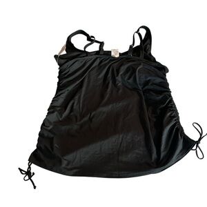Stylish black tankini top. Features adjustable straps. Side ruching detail.