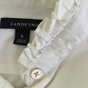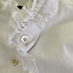 Soft Broadcloth washable non-wrinkle shirt with ruffled collar and front opening. Back is tailored for easy fit. It has been in my closet for a few seasons. Time to find someone who will appreciate it. I wore it under my dark grey cashmere blazer. and sometimes with jeans.