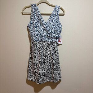 Lands End Blue Black Two Tone Floral One Piece Swim Dress Surplice V Neck Modest