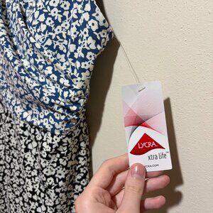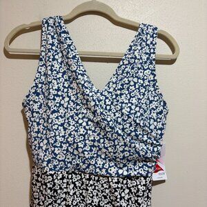 Lands End Blue Black Two Tone Floral One Piece Skirted Swim Dress. Surplice faux wrap V neckline. Top half blue floral, bottom half black floral. Sewn in cups.