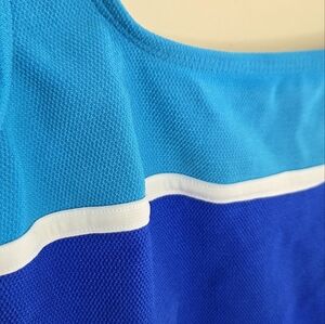 Classic textured square neck tankini swim top in two shades of blue with a white chest stripe.