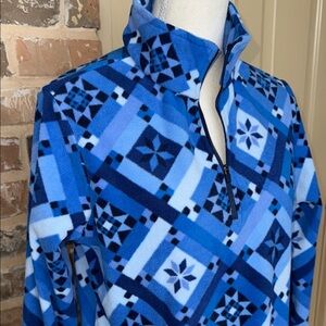 Lands End Blue Fleece Shift Dress Quilt Print 1/4 Zip Long Sleeve Pockets Sz S