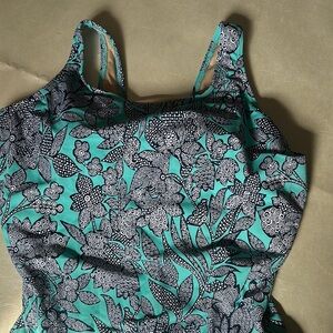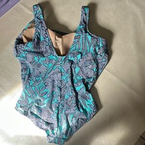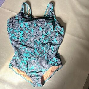 Stylish one-piece swimsuit with floral pattern. Features a vibrant blue base with intricate floral design. Perfect for beach or pool.