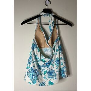 Halter Tankini top from Lands’ End. White with blue and green print. Ties at neck. Size 8. Gently preowned condition with no tears or stains.
