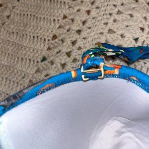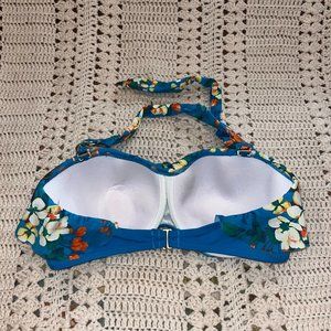 Lands End Blue Molded Cup Halter Bikini Top w/Tropical Floral Ruffle Size 14 D