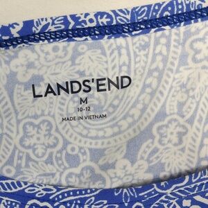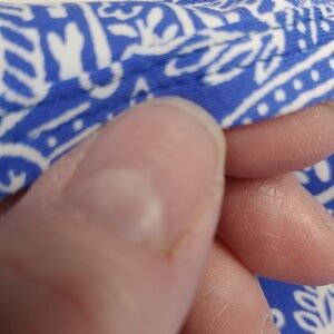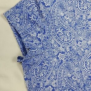 Elevate your wardrobe with this stylish blue paisley top. Perfect for any occasion, this top offers both comfort and elegance. There is no fabric content but it does have elastic in it