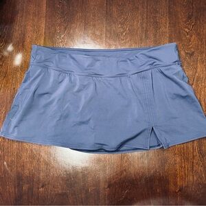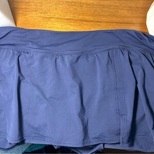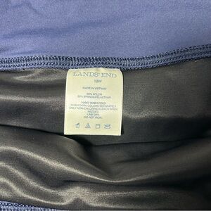 Navy blue size 18W plus size swim skirt from Lands' End with a wide waistband and gentle pleats for added movement. Made from lightweight, stretchy performance fabric.
