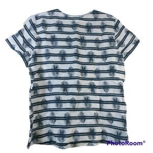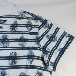 Lands' End Blue Stripe Linen Short Sleeve Top Palm Leaf Print