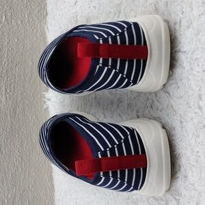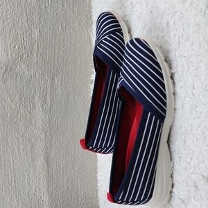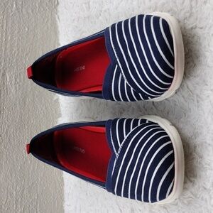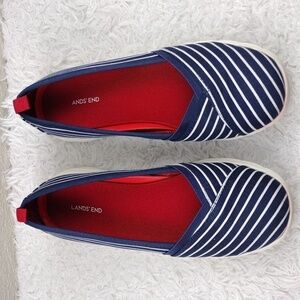 Lands' End Women's Red Blue White Striped Fabric Upper Round Closed Toe Low Wedged-Heel Slip On Sneaker Shoes. Textured Man Made Sole. Light Padded Fabric Footbed. Heel Pull Tab. Interior Heel Glue Marks Per Photos. Light Sole Marks. Size 7B Color May Vary Due To Lighting.