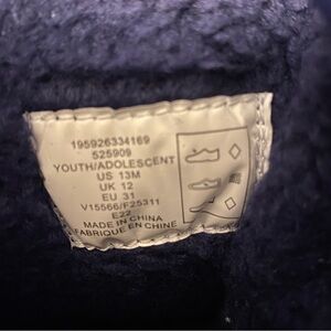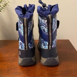 These Lands' End boots feature a waterproof upper and a thick rubber sole for excellent traction in wet and snowy conditions. The blue and gray color scheme is complemented by decorative patterns, while the velcro straps ensure a secure fit. Designed for warmth, these boots are insulated to keep feet cozy during cold weather adventures.