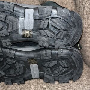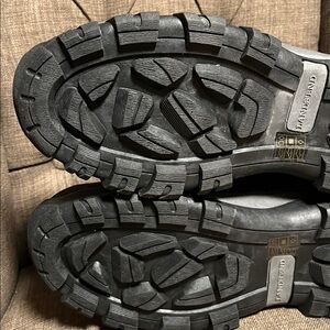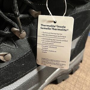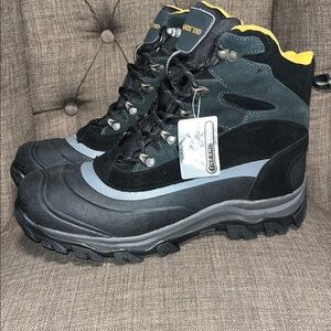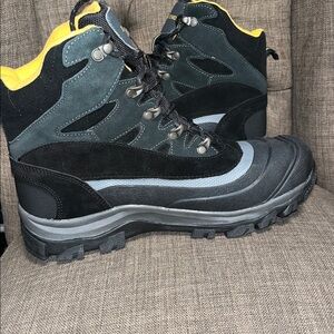 Stay warm and dry with these Lands' End hiking boots. Black exterior with yellow lining. Rugged sole for traction. Thermolite insole. New without tags... no box.