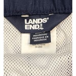 The Lands' End Boys Navy Blue Tropical Print Swim Trunks in size XL (14-16) are a stylish and practical choice for young boys heading to the beach or pool. Made of polyester material, these swim trunks feature a vibrant floral pattern in blue, perfect for a tropical-themed day in the sun. The elastic waist with drawstring ensures a comfortable fit, while the brief lining adds a layer of convenience and security. Easy to care for with machine washable instructions, these swim trunks are a must-have for any boy's summer wardrobe. Waist is 28 inches. Inseam is 8 inches.
