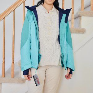 Warm winter jacket made using Primaloft insulation technology - superior warmth, water resistant, soft and compressible for high performance and comfort. A fun teal color to brighten the winter days. Never worn. *more green than appears in photos due to lighting