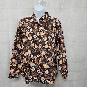 Lands' End Brown Orange Button-Down Blouse Floral Boho Cotton Size 14P