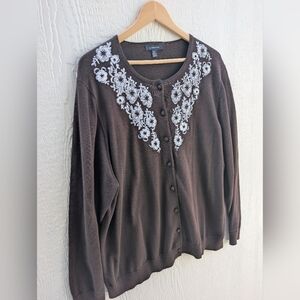 Lands' End Brown With White Floral Embroidery Knit Sweater Cardigan 2X 20-22W