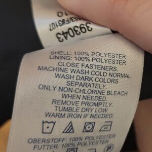 Excellent used condition. Dark Navy. Two pockets outside, four pockets inside. Fitted cut. Fully lined. All buttons are present. No stains or rips. Smoke-free home. Material is 100% Polyester.
