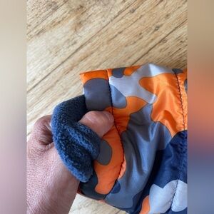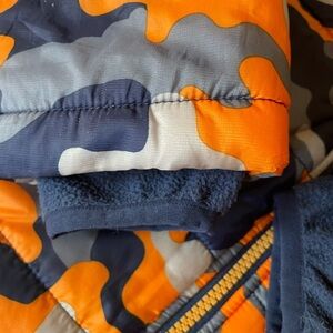 Cozy fleece jacket with camouflage lining. Features a mix of orange, blue, and gray.