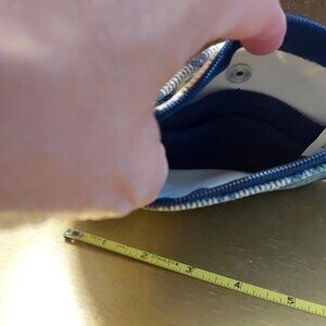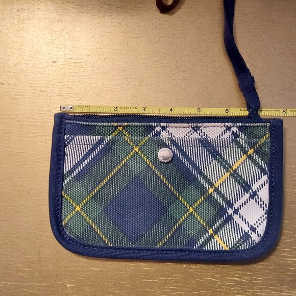 Land's End Canvas green, blue, and white plaid wristlet wallet.