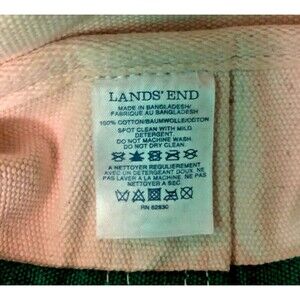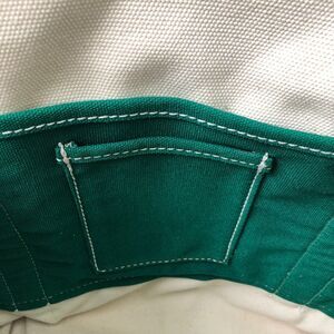 The Lands End Canvas Tote Bag is a large rectangular bag with a green exterior and cream lining. It features embroidered accents and a logo, making it perfect for a variety of occasions including travel, casual outings, and workwear. The bag has double handles with a green stripe, a matte finish, and pockets for added functionality. Crafted from durable canvas with a cotton handle strap, this tote is both stylish and practical for everyday use. Bag has been embroidered with the Louisville Parks Foundation logo.