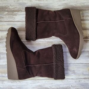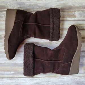 Lands End Chalet Pull-On Wedge Boot Brown Suede Faux Fur Lined Women's Size 7