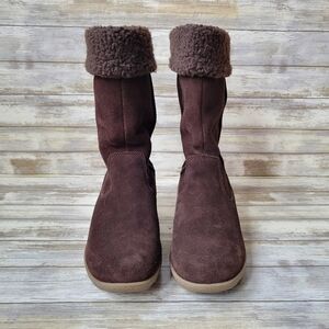 Lands End Chalet Pull-On Wedge Boot Brown Suede Faux Fur Lined Women's Size 7B