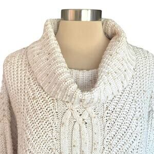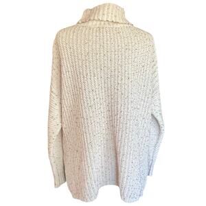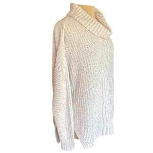 Lands' End Chunky Cable Knit Turtleneck Sweater Tunic Size M Marled Cream Color. Split at sides seams. 58% cotton, 36% polyester, 6% Merino wool. Dropped shoulders. Oversized and slouchy fit.