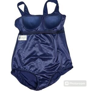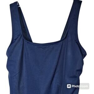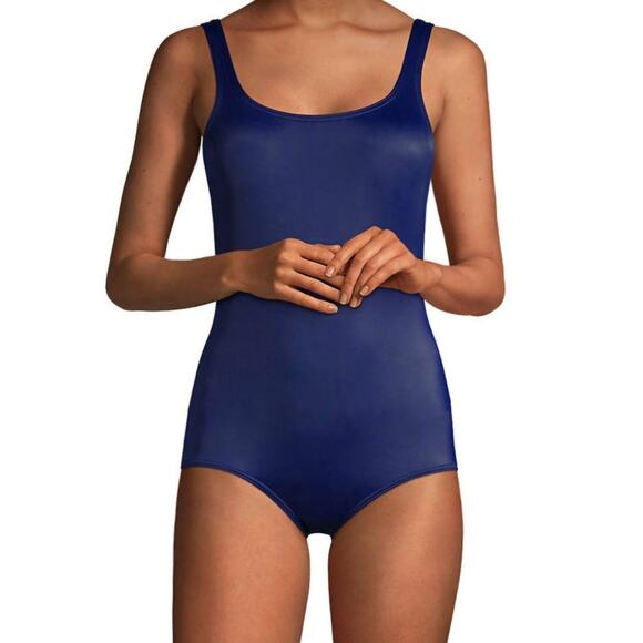 This is a NWOT classic, solid navy one-piece swimsuit from Lands' End. It is lined and features a built-in, lightly padded shelf bra. The Midwest swimsuit has a scoop neckline and back.