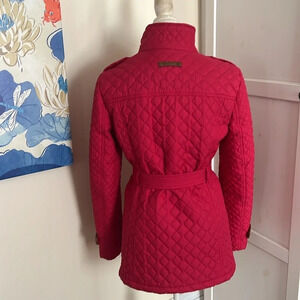 This Lands' End Classic Quilted Fall Jacket is gently used and in excellent condition. It has a button front and fabric belt, allowing for a personalized fit. There are pockets, including an internal pocket, and it is a berry red color.