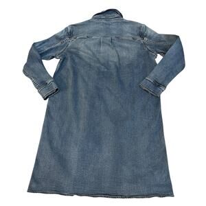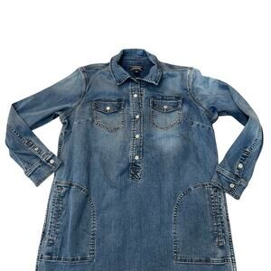 Denim dress. Long sleeve. Knee length. Stretchy. Has pockets. Snap closure.