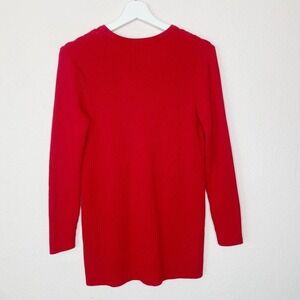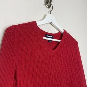 Great sweater by Lands' End. Red sweater with a diamond weave on front only. Ribbed hem, sleeves and back. Hem has a small split as sides. V-neck. Closet staple sweater! All measurements are approximate and taken flat.