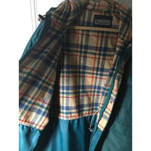 Lands End Direct Merchant green with plaid interior zip front hooded cold wet weather jacket. Water resistant outside. Has double zipper, can open top or bottom. Has two large top Velcro pockets and two large Velcro pockets on bottom. Zippered inside pocket. Has both a hood and waist cinch. No size or care tag. Size appears to be at least a extra large. Pit to pit measures approximately 28”. Shoulder to hem measures approximately 34”. Some faint staining around front edge of hood, see photo. Otherwise, very good pre-owned condition.