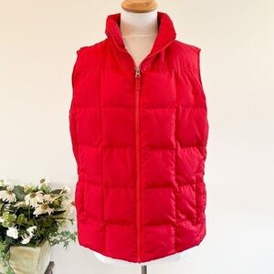 Lands’ End Red Down Vest. Features warm down insulation, zip front, stand up collar, rear wide elastic waist, snap front slant pockets.