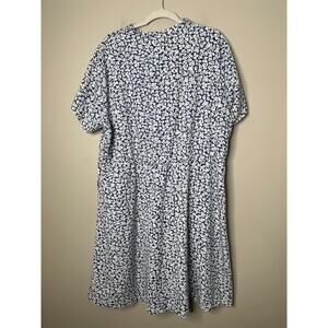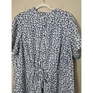 Lands End Dress 1X Blue White Floral Tie Cinched Waist Coastal Preppy Button