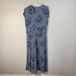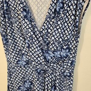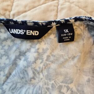 Lands End Dress Women's 1X 16W-18W Blue White Tropical Floral Tile print Surplice Bodice Short sleeve Coastal Summer party nautical classic vacation resort wear