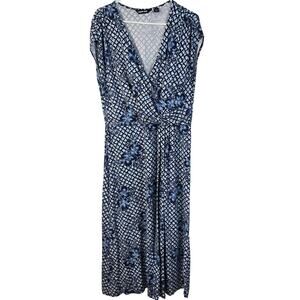 Lands End Dress Women's 1X 16W-18W Blue White Tropical Floral Surplice Coastal