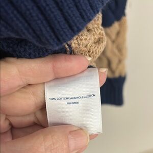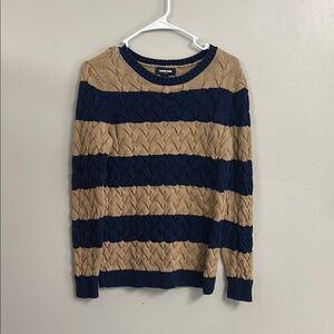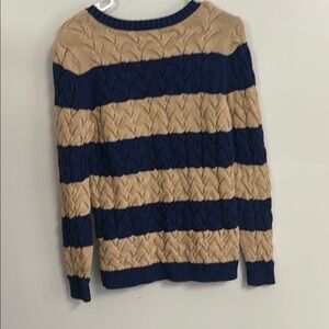 Cozy cable knit sweater with bold tan and navy stripes. Perfect for a casual look.