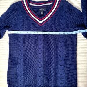 Cozy and classic, this Lands’ End Drifter sweater is crafted from 100% cotton in a deep navy blue. It features a timeless cable knit design, V-neckline with red and white striped trim, and ribbed cuffs with matching stripes. A versatile medium weight piece that’s perfect for layering in fall, winter, or early spring. Women’s size Medium (10-12).