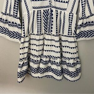 Lands’ End Embroidered Tiered Mini Dress Geometric Blue White Cotton Blend