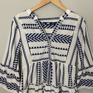 Lands’ End Embroidered Tiered Mini Dress Geometric Blue White Cotton Blend M