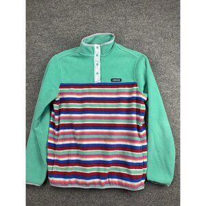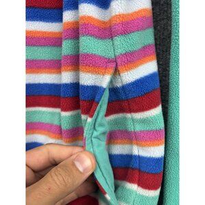 Lands' End Fleece Pullover Youth 10-12 Green Multi Stripe Quarter Snap Pockets