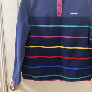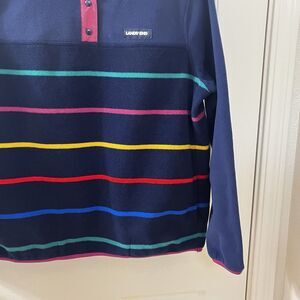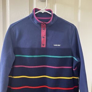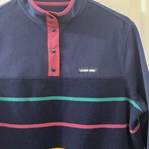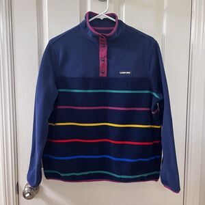 Lands' End Fleece Snap Neck Pullover Navy Blue Colorful Striped Women's Size Medium 10-12. Has been worn and washed, but no issues that I can find. Good Used Condition.