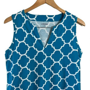 Lands End Geometric Sleeveless Dress Small All Over Pattern V Neck Blue White