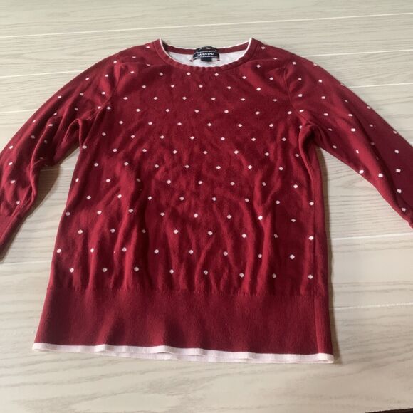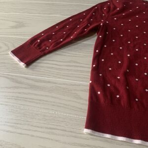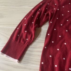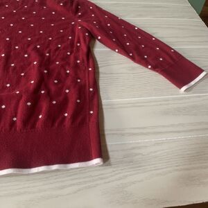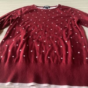 This is a Girls' Medium Red Lands' End sweater with white hearts. It is a pullover style sweater made from a knit fabric. Perfect for adding a pop of color and fun to a girl's wardrobe, this sweater is both stylish and cozy for cooler weather.