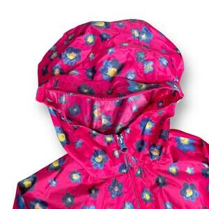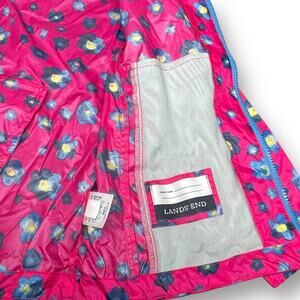 Lands End Girls Rain Jacket Size 14 Hooded Windbreaker Full Zip Nylon Floral Pink Packable Travel Hack Holiday Vacation