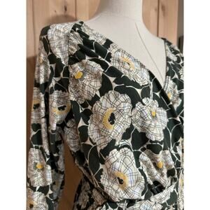 Lands End floral cotton wrap dress in size medium (10-12) Dark green with white and yellow floral print. Wrap top with elastic waist and belt. Long sleeves Midi length. Soft and lovely cotton material with some stretch. Very comfortable and flattering style! Machine wash. Excellent pre-owned condition - no issues. See photos for measurements and material care.