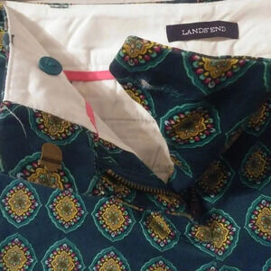 Lands End Green Print Capris Pants. Side hook, zipper and button closure. 2 back faux pockets and belt loops. 28" inseam.
