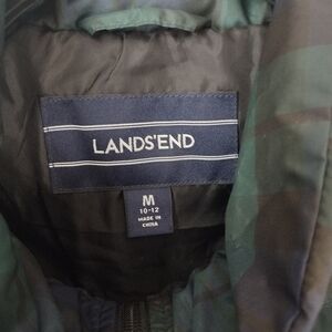 Lightweight puffer vest is from Lands End.  Green and navy blue in color.  Size Medium 10-12