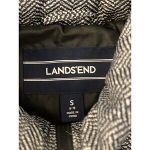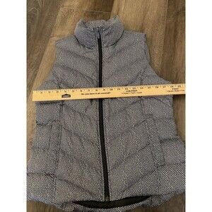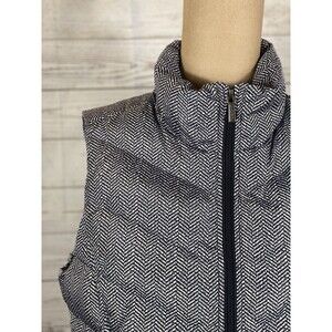 The Lands End Herringbone Zip Up Down Puffer Vest in Women's Size Small is a stylish and practical outerwear option for any season. Made of polyester with a quilted design, this mid-length vest features a black and white chevron pattern and front pockets for added convenience. The 80% down and 20% feather insulation ensures warmth during outdoor activities, while the regular fit and sleeveless design provide comfort and mobility. Easy to care for with machine washable instructions, this Lands End vest is a versatile addition to any wardrobe, perfect for travel or casual wear.